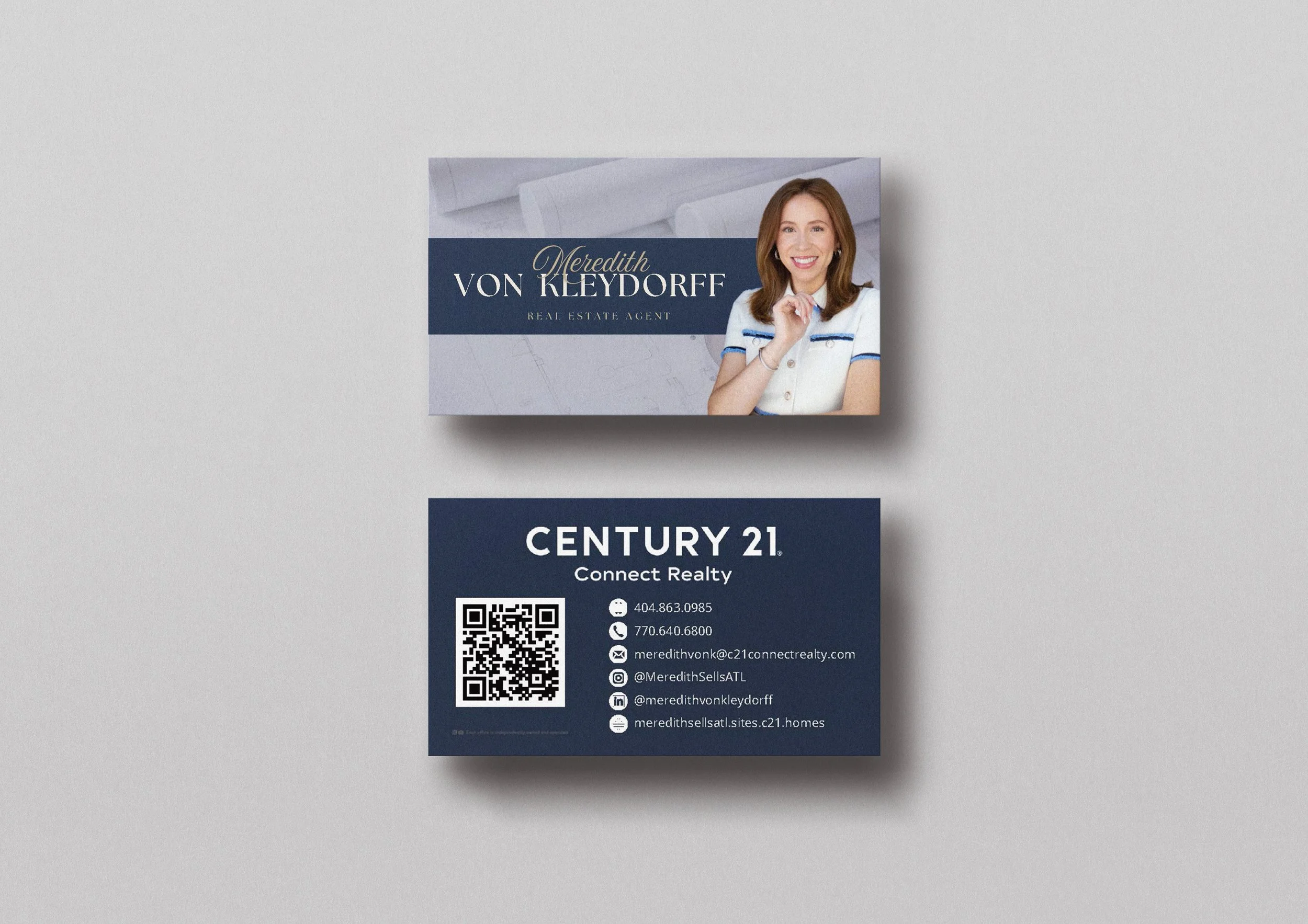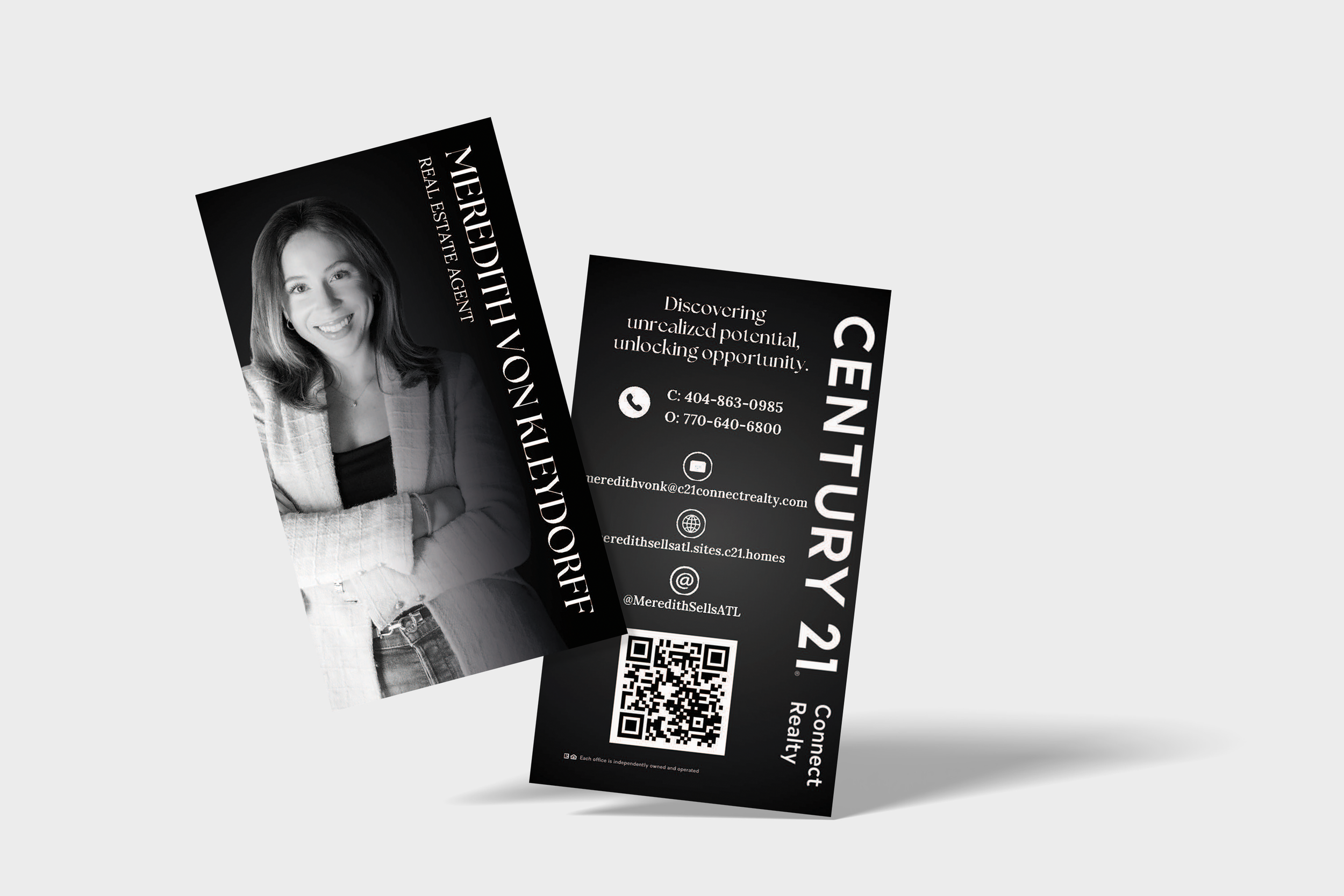 C21 agent Meredith Von Kleydorff target clientele is investors and young professionals looking in the outer Atlanta area. Meredith had requested these 2 business cards and had already had designs picked out that she wanted implemented into her own branding. For her investor business she focuses on a black and white palette, while the residential side of her business focuseses on a white and navy blue color scheme.