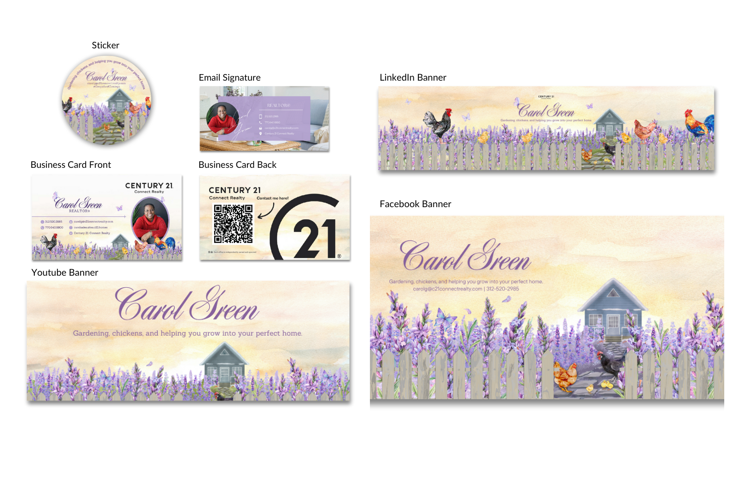 Carol Green is a C21 agent who enjoys farming and gardening, which she wanted to translate into her branding. While focusing on older generations, she wanted her brand to feel homey and incorporate the things you can find at her home: Fields of lavender and her chickens.
